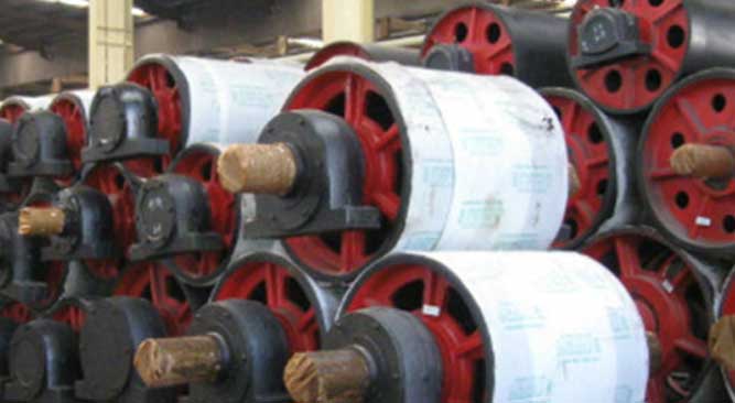 皮帶輸送機的牽引力是通過傳動滾筒與皮帶間的摩擦力來傳遞的,運焦車間各系統皮帶輸送機在用的傳動滾筒大多為鑄膠材質,滾筒外層的表面帶有均勻的淺溝壑。當皮帶經過一段時間的使用后,滾筒外層的鑄膠逐漸受到磨損,當滾筒與膠帶的摩擦力不夠時,出現主傳動滾筒轉動而膠帶不動或不同步運行的打滑現象。在皮帶輸送機傳動滾筒磨損不是很嚴重時為解決打滑現象,我們以前通常采用調整皮帶的拉緊裝置以改變皮帶張力(在皮帶強度許可的范圍內調整)的方法,這樣在消除皮帶打滑的同時,又容易出現局部跑偏以及加劇皮帶對傳動滾筒的磨損,一般3年就要對其進行更換,更換時不僅需要大量人力、物力,而且需要較長的檢修時間,嚴重影響輸送設備正常生產。