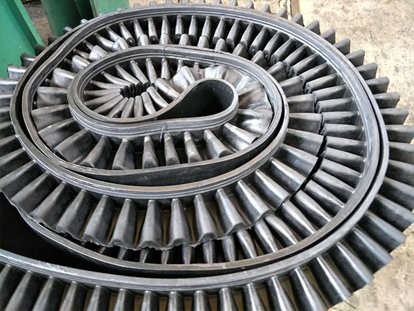 大傾角輸送帶超過70度角應(yīng)采用覆蓋帶,使用覆蓋帶的好處防止漏料對基帶造成損傷;同時也能增加物料的運量。在選擇隔板裙邊時應(yīng)先考慮輸送機的輸送量,如:裙邊高度、隔板間距大小、有效帶寬的大小。