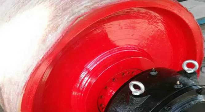設備長期時間運行過程中,會出現正常或意外的磨損、老化等問題,導致故障的發生,直接影響生產的正常運行。各工礦企業都在積極尋找快捷、高效、可靠的設備修復維護技術。滾筒包膠:是用來增大傳動時輸送帶與筒體表面的磨擦導數,以減少輸送帶在筒體表面的摩擦系數,以減少輸送帶在筒體表面的滑移機相互磨損,提高運行的牽引力,延長輸送帶和電動滾筒的使用壽命?;居腥N方法:熱硫化,冷粘(不用硫化),耐磨陶瓷。只說前兩種。其主要工藝區別是:熱硫化包膠的工藝是,將筒皮在車床車削約2-3mm深的螺紋溝槽,涂刷兩層粘接劑(鐵性粘接劑、橡膠粘接劑),然后將生膠板壓實在滾筒筒皮上,入硫化蒸汽爐加熱180℃硫化,硫化完成出爐后上車床車削包膠花紋。主要有:改向滾筒:改向滾筒僅作為引導輸送帶改變方向的圓柱形筒.改向滾筒不承擔轉矩,結構比較簡易.傳動滾筒和驅動裝置相聯,是帶式輸送機重要的部件,傳動滾筒表面同輸送帶之間的摩擦系數和輸送帶在該滾筒上的包角驅動來改變功率.